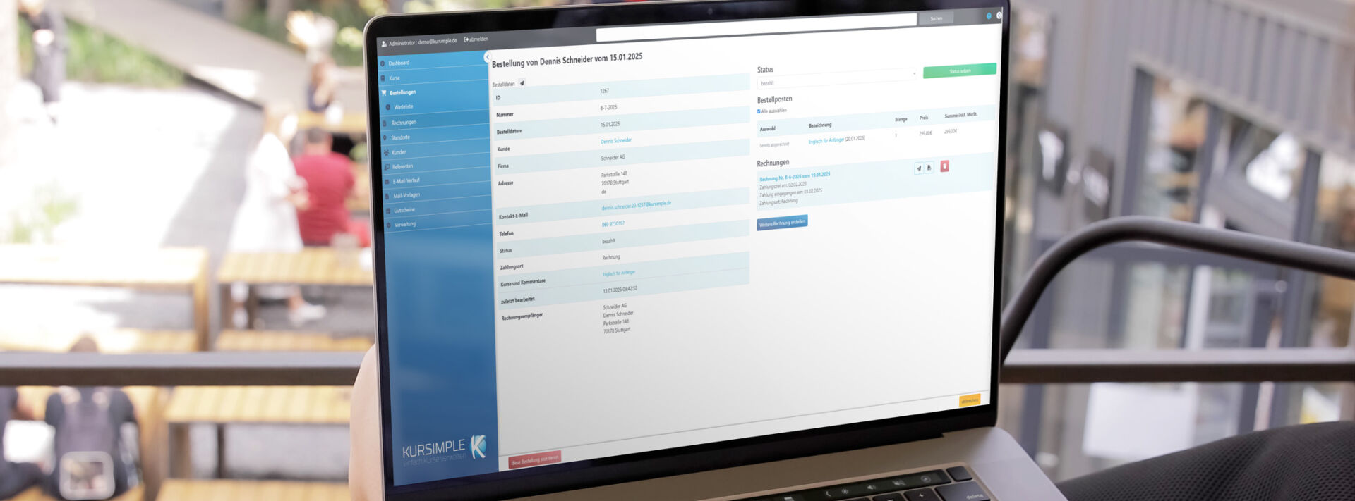 Um zu erleben, wie einfach sich Kurse, Bestellungen und Rechnungen verwalten lassen, müssen Sie sich mit den Zugangsdaten „ausprobieren@kursimple.de“ und dem Passwort: „demo123“ einloggen.